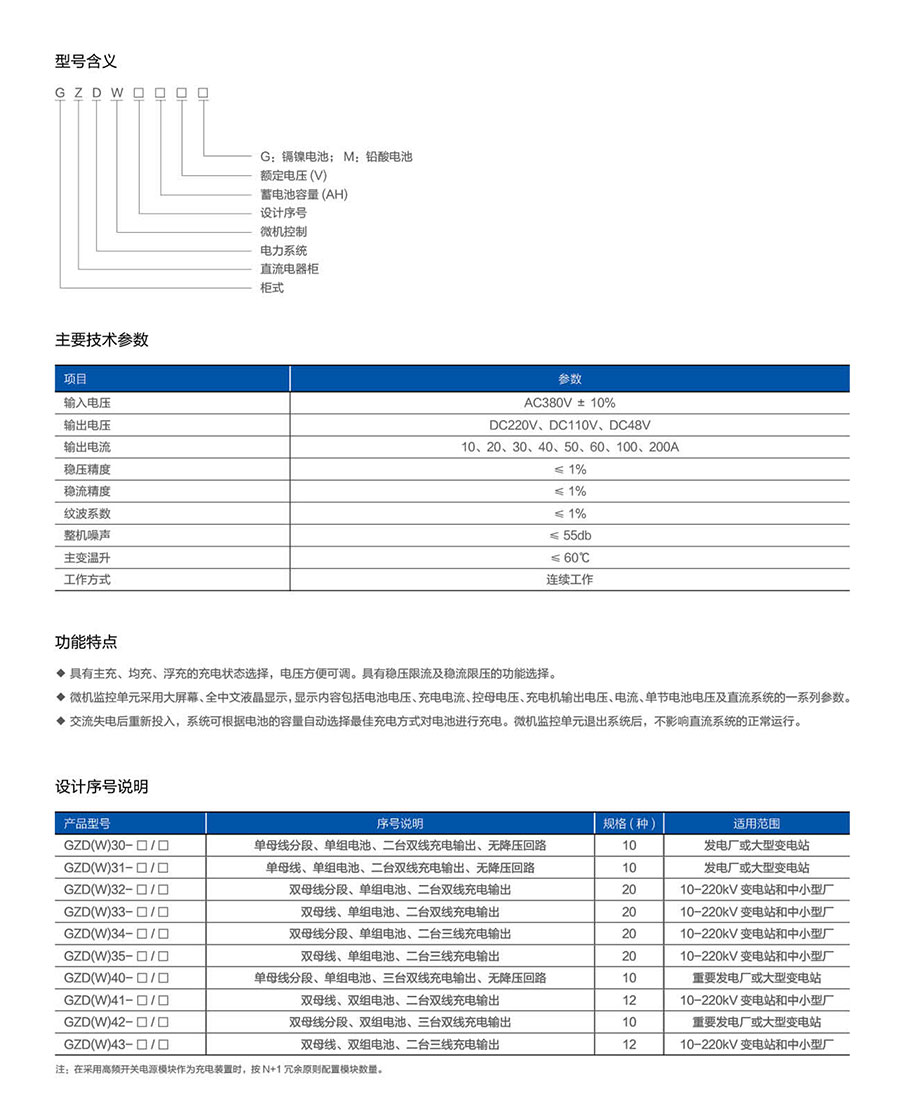 GZD(W)系列(微机控制)直流电源柜是针对无人值守变电所对直流电源柜所提出的要求而研制开发的新一代替换产品。适用于大中小型发电厂和变电站,在正常运行和事故状态下的高压开关分合闸、继电保护、自动控制、事故照明等所需的直流电源。