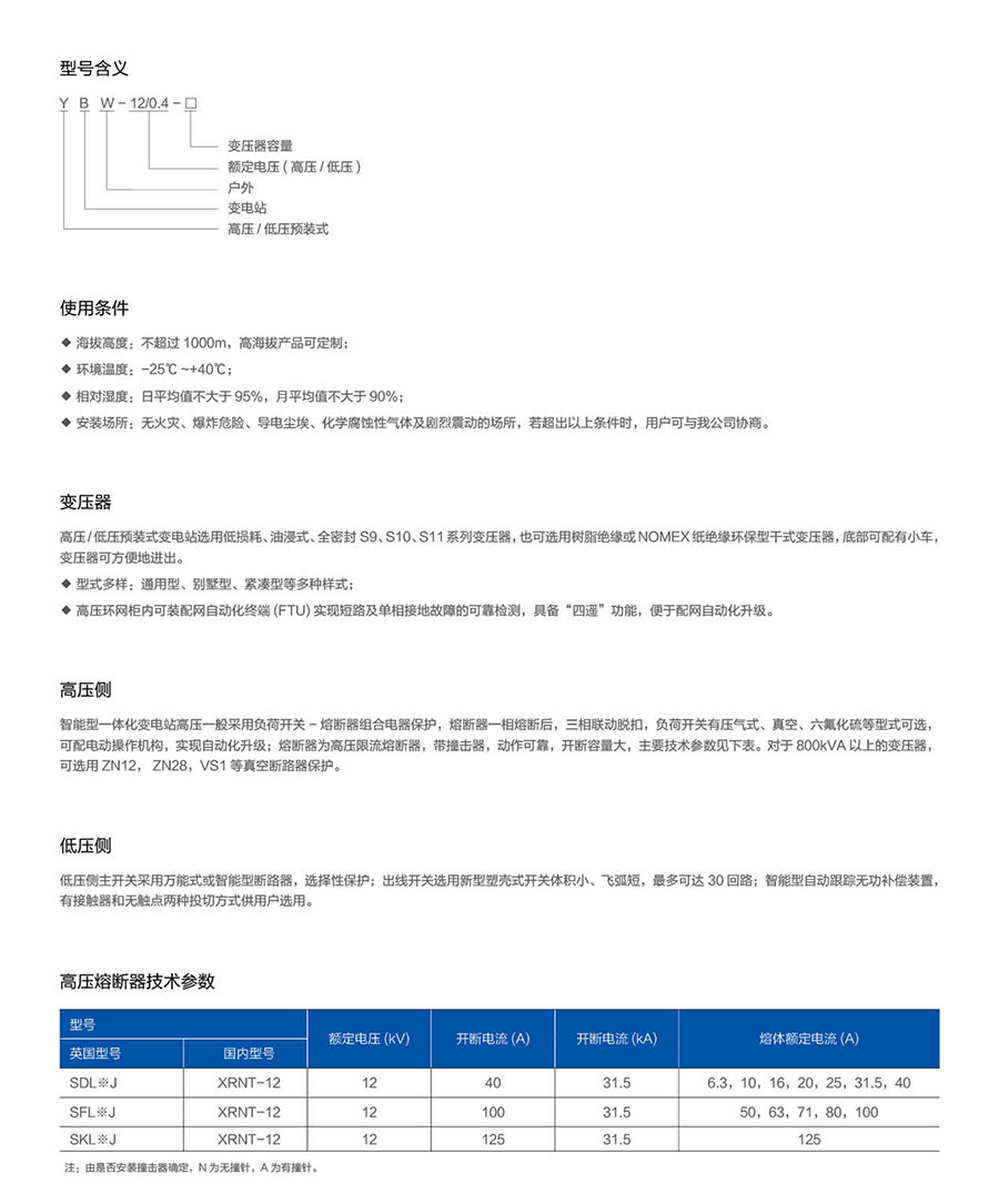 YBW-12/0.4户外预装式变电站(欧式)广泛用于城市电网改造、住宅小区、高层建筑、工矿、宾馆、商场、机场、铁路、油田、码头、高速公路以及临时性用电设施等户内外场所。