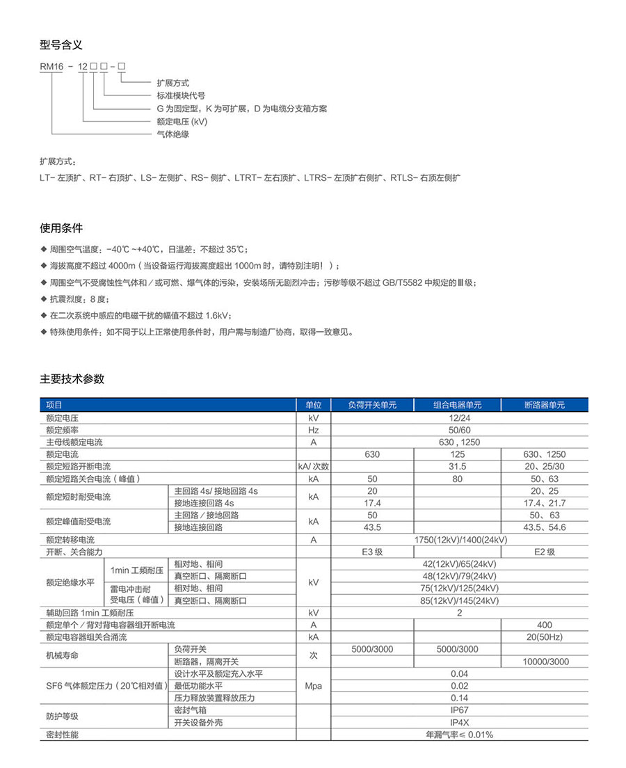 RM16-12气体绝缘金属封闭开关设备系12kV,三相交流50Hz,单母线及单母线分段系统的成套配电装置。该产品具有结构简单、操作灵活、联锁可靠、安装方便等特点,对各种不同应用场合,不同用户均能提供令人满意的技术方案。传感技术、信息化技术的采用,加上先进的技术性能及简便灵活的配置方案,可以满足市场不断变化的需求,并适用于电网智能化要求。该环保气体绝缘环网柜适用于工业及民用电缆环网及配网终端工程。作为电能的接受和分配之用,特别适用于城市居民区配电、小型二次变电所、开闭所、电缆分支箱、箱式变电站、工矿企业、商场、机场、地铁、风力发电、医院、体育场、铁路、隧道等场所使用。